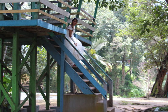 Das Wasser fällt über ein paar Felsblöcke noch einmal zehn Meter tief und es gibt eine wackelige Holzkonstruktion, auf der man das Schauspiel besser beobachten kann. Da entdecke ich wieder einmal eine Pre-Wedding. Die Braut trägt ein weisses, weit ausgestelltes Kleid und einen künstlichen Rosenstrauss.