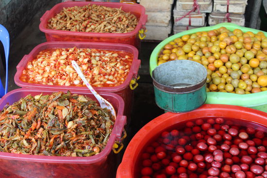 An den Ständen wird ein Fruchtwein verkauft. Dieser wird hier in der Gegend produziert aus Früchten, die wie Kirschen oder Mirabellen aussehen.