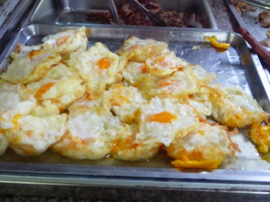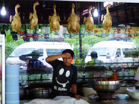 Auf halber Strecke gibt es einen Halt. "20 Minunten, die Toilletten sind da hinten", verkündet der Fahrer. Ich sehe mich bei der Essensausgabe um. Die aufgehängten Hühner geben ein skurriles Bild ab, und auch die gebratenen Spiegeleier sind eher kurios.