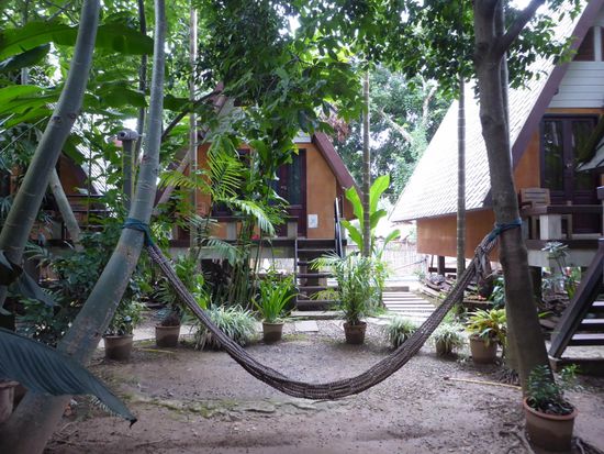 Die "Breeze of Pai" ist eine einfache Unterkunft mit einfachen Bungalows in einem Garten mit vielen exotischen Pflanzen. Die Heliconia neben meinem Häuschen und die Hängematte im Garten machen mir das Haus auf Anhieb sehr sympathisch. Und auch den Typ, der mich vor dem Haus von der Wand so freundlich begrüsst hat, finde ich süss. Ich sag's ja, an solchen Tagen sind es die kleinen Begegnungen, die es ausmachen.