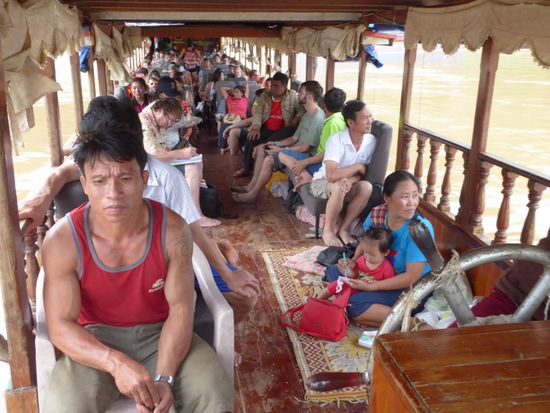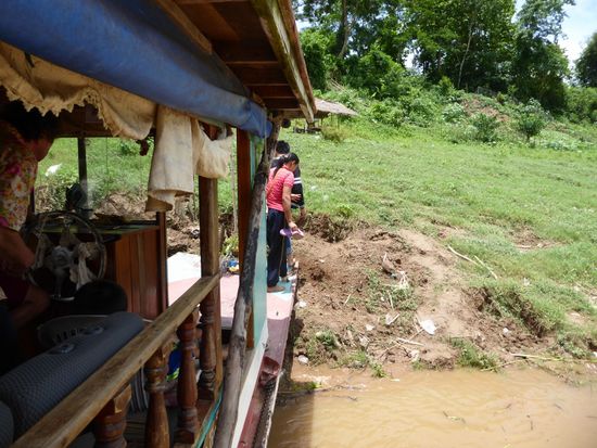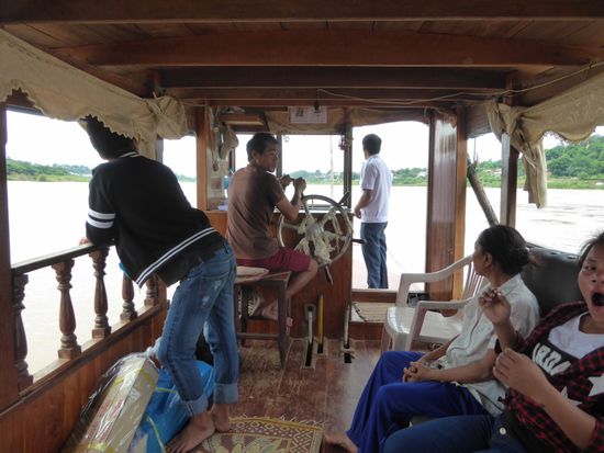 Wir fahren über die Thailändisch-Laotische Freundschaftsbrücke und sind jetzt in Laos. Eine junge Frau holt uns ab und begleitet uns zur Ablegestelle. Sie organisiert unsere Schiffsticket und gibt letzte Tipps. Im Boot gibt es einen kleinen Shop, wo man Snacks und Getränke kaufen kann. Ausserdem gibt es eine Toilette. Das ist doch schon mal eine gute Information. Ich decke mich im Restaurant noch mit Mineralwasser und einer Flasche Coca Cola ein und , benutze noch einmal die Toilette dann geht es an Bord.