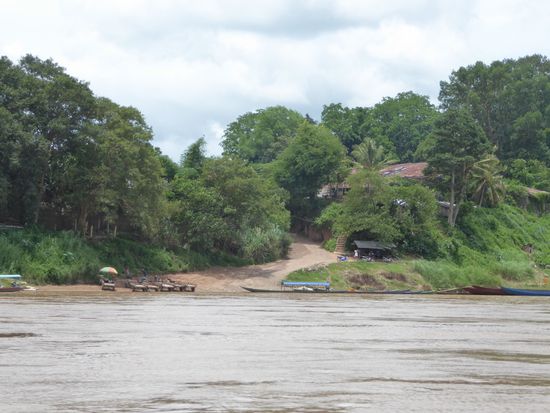 Die Zeit zieht sich dahin, ich betrachte das Ufer, manchmal erkennt man Bauern, die den Boden bearbeiten. Bananenplantagen, Gärten. Kleine Siedlungen, die aus ein paar Hütten bestehen. Oft stehen sie auf Pfählen, obwohl der Mekong wohl kaum so stark über die Ufer tritt und die Häuser eh meistens auf den Anhöhen stehen. Es gibt kleine Sandbänke, Strände und Buchten im Fluss, wo das Wasser ruhiger steht.