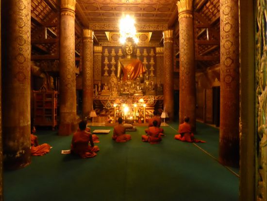 Ich geniesse einen Fisch im Bananenblatt gekocht, mit weissem Reis und schlendere dann auch zurück ins Hotel. Bei der Pagode werfe ich noch einen Blick durch die offene Türe. In völliger Stille und Konzentration sitzen hier ein paar junge Mönche beim Meditieren.