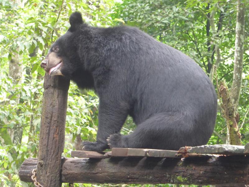 Wo bin ich da hingeraten. Ich habe Wasserfall gebucht und bin im Bärenland gelandet. Die Hinweistafeln klären mich auf. Es ist ein Rescuecenter, ein Auffangcenter für Bären, die aus illegalem Handel befreit wurden. Es sind knapp 40 Stück, die hier in grossen Gehegen in kleinen Gruppen leben. Im Moment scheinen sie Siesta zu halten, nur selten dreht einer seinen Kopf, kippt sich in eine neue Position und schläft weiter.