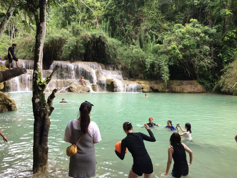 Inzwischen haben die jungen Leute den Absprungplatz wieder frei gegeben und andere springen jetzt herunter, während die Gruppe den Wasserfall als neuen Catwalk erkohren hat. Es macht Spass, ihnen zuzusehen, wie sie sich in Pose werfen, Selfies und Panoramabilder schiessen, ihre eingepackten Handys und Kameras an Stecken vor sich schwenken und einfach Freude haben und verbreiten. Auch die beiden Koreaner, die vorher noch unschlüssig im Wasser getummelt sind, haben inzwischen die höchste Stufe des Wasserfalls erreicht und machen fröhliche Bilder von sich und der Umgebung. Mich spricht ein junges Mädchen an. Woher kommst du? Sie kommt mit ihren beiden Freundinnen aus China. Aber sie können nicht schwimmen, sind etwas verunsichert. Ich zeige ihnen, dass sie ohne weiteres noch weiter ins Wasser gehen und immer noch stehen können.