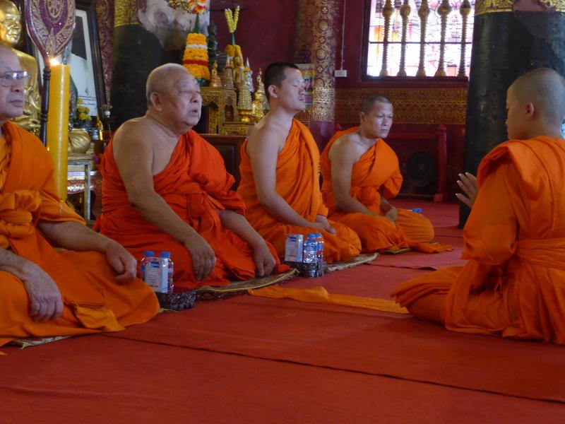 Jetzt kommen weitere Verwandte in den Tempel. Es wird geschwatzt. Auch die beiden älteren Mönche unterhalten sich. Die Familie verteilt Wasserflaschen und Tetrapack mit Orangensaft. An alle, die grad im Tempel sind, also auch an mich. Und dann kommt der junge Mann zurück. Neu eingekleidet und die Zeremonie, das Beten, das Verneigen gehen weiter.