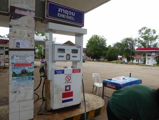 Nachdem wir uns einig sind, muss er nur noch noch rasch bei der Tankstelle vorbei. Sie ist bedient, klar, wer hat hier schon eine Karte, und er tankt für 70000 Kip, das sind ziemlich genau acht Franken.