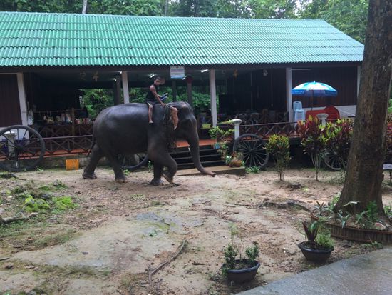 Hier also sind die Elefanten noch am Arbeiten, es sind ein paar wenige Touristen hier, aber jetzt am späteren Nachmittag ist nicht mehr viel los. Der Mahud macht eine Promotionstour durch das Gelände. Imposant ist es schon, das mächtige Tier durch den Wald schreiten zu sehen, ins Wasser steigen und dann taucht es gar unter. Und steigt auf der anderen Seite des Wasserbeckens wieder aus dem Wasser, macht einen Halt beim Restaurant, wo der Mahud sich eine Cola geben lässt. Der Elefant nimmt die Flasche entgegen und gibt sie weiter, packt das Geld mit dem Rüssel und übergibt es der Bedienung, dann trabt er weiter.