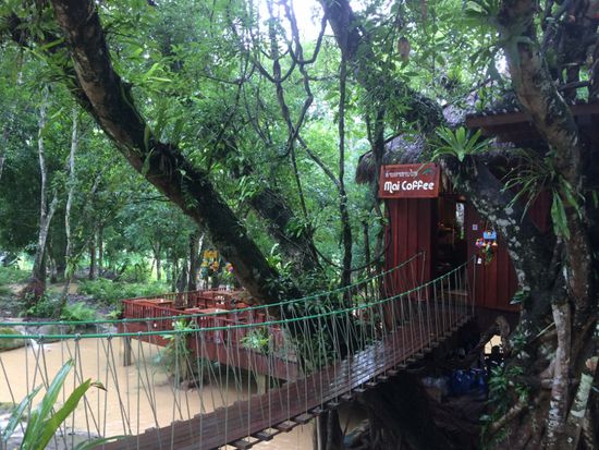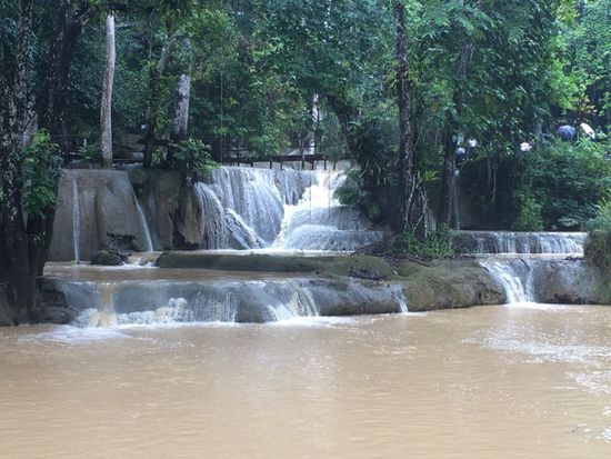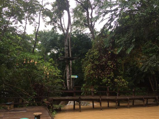 Die Beschreibung war wohl nicht von einem Regentag, denn heute ist das Wasser braun. Bestimmt sieht das in der Trockenzeit ganz anders aus, heute ist alles etwas trübe. Schade, wenn es trocken wäre, wäre das bestimmt ein schöner Platz um einen ganzen Tag zu verbringen. Es gibt sogar eine kleine Zipline und einen Klettergarten, dazu ein paar Restaurants und Spazierwege durch den Dschungel.