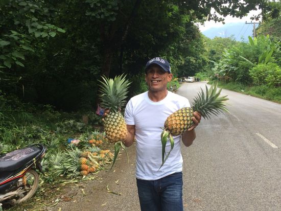 So ein TucTuc ist ein eigenartiges Gefährt. Eine Art kleiner PicUp. Die Passagiere sitzen hinten auf der Ladefläche in einem käfigartigen Aufbau. Der Fahrer in seiner kleinen Kabine. Gespräch ist keines möglich, wenn ich irgendwo anhalten möchte, zum Beispiel um die vielen Ananasstände am Wegrand zu fotografieren, muss ich an die Scheibe klopfen und hoffen, dass er mich bei all dem Lärm, den der Aufbau macht, überhaupt hört.