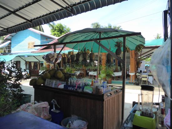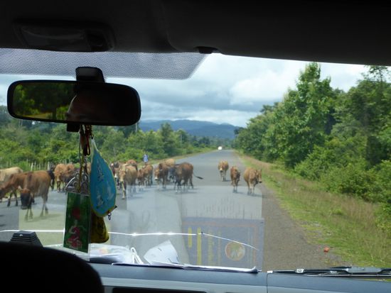 Wir fahren über eine gut ausgebaute Strasse Richtung Süden. Verkehr herrscht wenig. Manchmal ein Minivan, ein Motorrad oder eine Herde Kühe, die sich langsam von der Strasse bewegt, wenn sich ein Auto nähert. Ob man die Kühe melkt, will ich von Khan wissen, die Tiere sehen alle so klein aus und ich kann keine Euter erkennen. Nein, die Kühe werden wegen des Fleisches gehalten, die Milch wird aus Thailand bezogen.