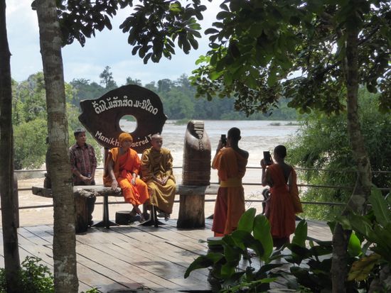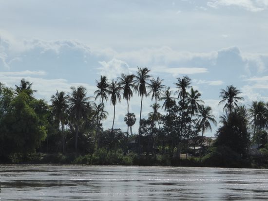Nach gut zwei Stunden erreichen wir die kambodschanische Grenze. Hier ist der Mekong kilometerbreit, hat sich in mehrere Arme geteilt und rauscht über breite Stromschnellen ein paar Meter tiefer. Diese Stromschnellen, Wasserfällen gleich, sind der Grund, dass der Mekong nicht durchgehend mit Schiffen befahren werden kann. Gewaltige Wassermassen stürzen ein paar Meter über die Felsen und erinnern mich an den Rheinfall, bei Hochwasser.