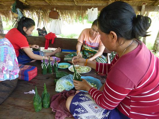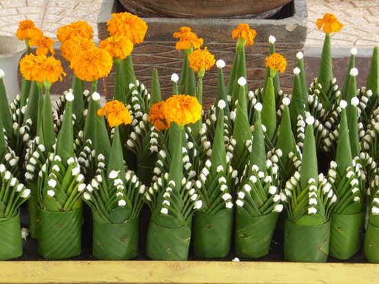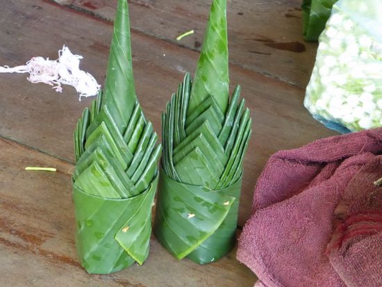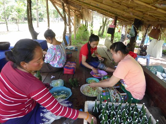 Auf der anderen Seite ist Kambodscha. Es tut gut, ein wenig die Füsse zu strecken, aber schon bald heisst es weiterfahren. Wir kommen noch an einer Gebetsstätte vorbei. Hier wird nicht ein Buddha verehrt, sondern ein heiliges Holz. Man weiss nicht woher es kommt und um was für einen Baum es sich handelt, erklärt Khan. Jedenfalls wurde ein riesiger Schrein darum gebaut und die Frauen basteln ihre Dekorationen, die man kaufen und opfern kann. Ich sehe ihnen noch einen Moment zu. Gefalten aus Bananenblättern und verzieht mit Jasminblüten und gelben Tagetes sind sie eine filigrane. sehr aufwändige Arbeit.