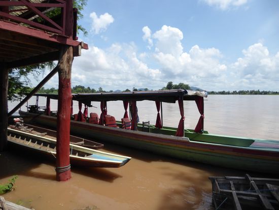 Wir fahren mit unserem Boot weiter und nach zwei Stunden erreichen wir die Vat Phou, unser Schiff für die nächsten zwei Tage.