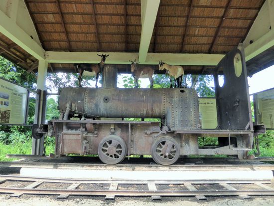 Zwar wird für den Zugang ein Eintritt verlangt – und die Einheimischen werden sich bestimmt über die Touristen amüsieren, die extra hierher pilgern - aber die Herren über die Lokomotive sind eindeutig drei Ziegen. Sie sind schon lange hier, das zeigen ihre Hinterlassenschaften rund um die Lokomotive. Den informationstafeln kann man sich nicht mehr nähern ohne in der Sch… zu stehen, darum bleiben die Informationen über das Zugprojekt unvollständig.