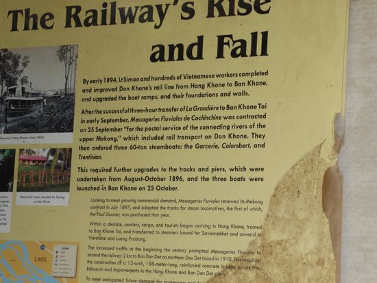 Nach dem Essen machen wir uns zu Fuss auf den Weg zu einer skurrilen Sehenswürdigkeit. Um die Stromschnellen zu umgehen und Waren aus dem oberen Teil des Mekong bis ins Meer zu transportieren, kamen die Franzosen im 19. Jahrhundert auf die Idee, eine Zugstrecke zu bauen. Sie wurde um 1894 gebaut und ob sie überhaupt je in Betrieb kam, kann ich nicht klar verstehen, aber war sie bestimmt nicht im Einsatz, denn die Streckenführung über die Inseln und das Umladen war wahrscheinlich zu kompliziert. Jedenfalls war es der einzige Zug in ganz Laos, der je gebaut wurde, und geblieben sind die beiden Schienenstücke und eine rostige Lokomotive.