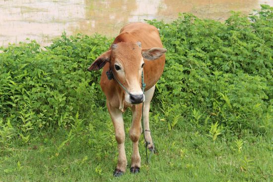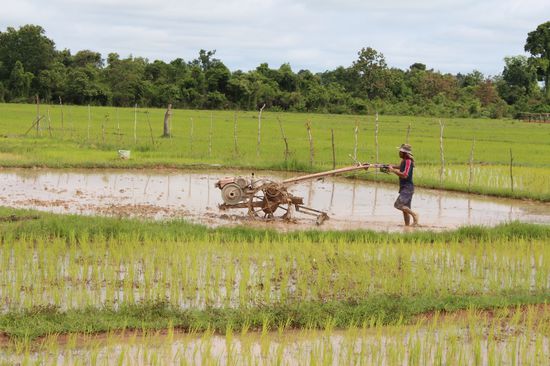 Die Menschen sind Selbstversorger. In ihren Gärten bauen sie Gemüse, Früchte und Blumen an. Auf den Reisfeldern wird im Moment der Reis ausgepflanzt. Die meisten Arbeiten werden hier noch von Hand ausgeführt. Einzig die Wasserbüffel werden mit der Zeit durch Maschinen ersetzt. Dafür werden ein paar Kühe und Hühner gehalten, dort sehe ich zwei Gänse, und natürlich wird auch auf dem Mekong gefischt.