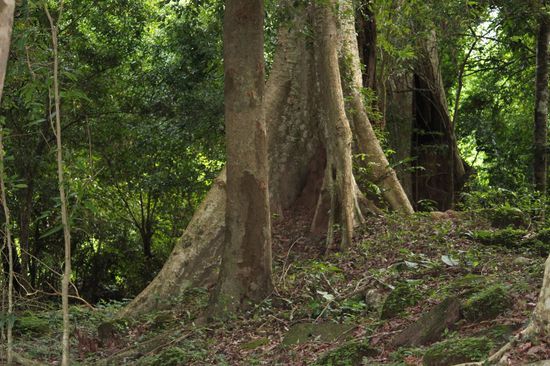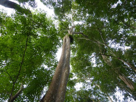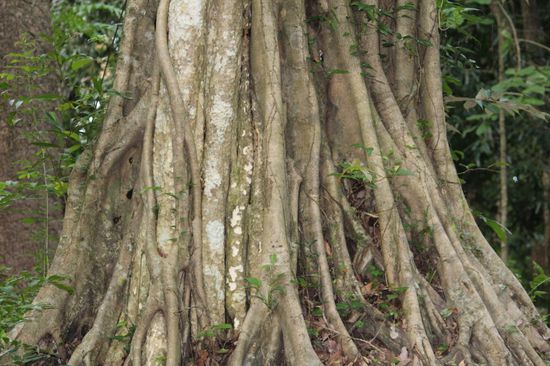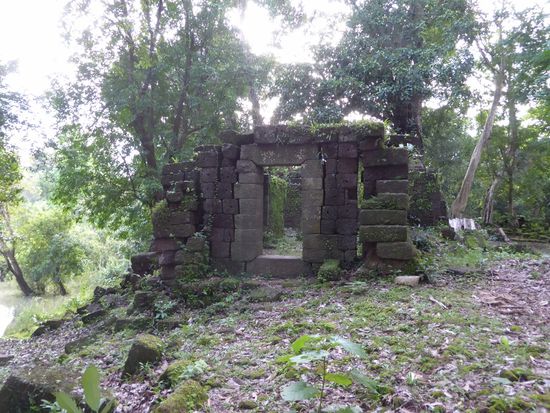 Am späteren Nachmittag legen wir wieder am Ufer an. Wir besuchen eine alte Kultstätte im Dschungel. Hohe Bäume stehen da, in denen man irgendwo Tiere kreischen hört. Gibbons leben hier, erzählt Khan auf Nachfrage. Doch sie würden sich gut verstecken, man kann sie nicht sehen.