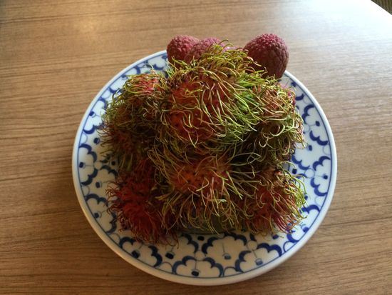 Hier gibt es einen Pool, den ich mir bei Gelegenheit ansehen werde und einen Spa-Bereich. Und im Zimmer gibt es frische Früchte. Lychies, mit und ohne die weichen Stacheln.