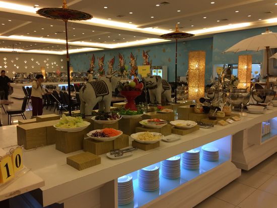 Leider ist der Essens-Teil nicht umwerfend. In einer grossen Halle mit dem Charme einer Flugzeug-Wartehalle stehen Tische bereit und aus grossen Wärmepfannen dampft veschiedenes Essen. Das Angebot ist riesig und gegen das Essen ist auch nichts zu sagen, aber für ein feines Essen fehlt tatsächlich alle Atmosphäre. Auch die Angestellten können mit ihrem Lächeln nichts verbessern, denn sie schenken es nur bruchstückhaft, für mein Getränkt muss ich zweimal nachfragen.