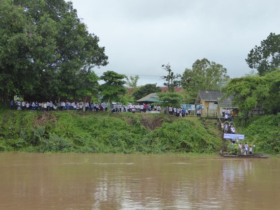 Schon bald nach dem Frühstück, das wir während der Fahrt eingenommen hatten, steuern wir wieder das Ufer an. Unser letzter Ausflug steht an. Doch offensichtlich ist es im Moment nicht möglich bei der Anlagestelle sind viele Leute versammelt.