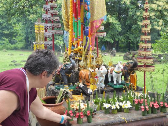 Und dann sind wir oben, besuchen den Buddha im Tempel und lassen uns von Khan ein paar Zeichen erklären. Dann steigen wir noch einmal ein paar Stufen hinauf bis zum überhängenden Felsen, zur Quelle des heiligen Wassers, die nie versiegt. Es gibt auch noch ein paar mit Moos überwachsene Überbleibsel eines früheren Gebäudes und Treppenstufen mit Schlangenmotiv. Der in den Stein gehauene Elefant ist später entstanden, aber auch bereits sehr alt.