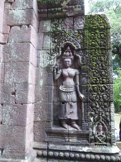 Khan zeigt uns in den steinernen Reliefs Zeichen der drei wichtigsten Hindugottheiten: Brahma (Schöpfer), Shiva (Zerstörer und Erneuerer) und Vishnu (Beschützer).
