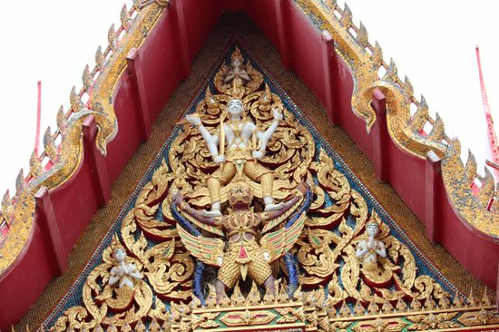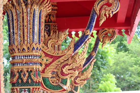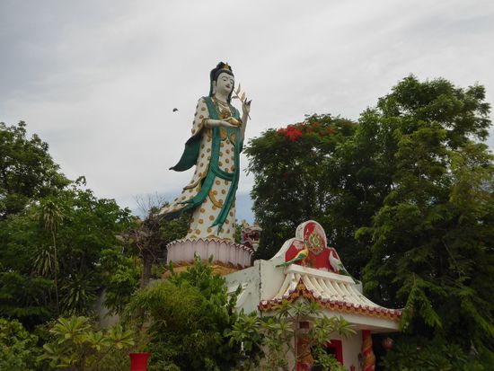 Ich konzentriere mich lieber auf das Sehen und versuche im ganzen Gewirr ein paar Fotos zu machen. Bald sind wir wieder aus dem Getümmel heraus und kommen zu einer schönen Pagode. Hier steige ich aus. Beim Eingang steht ein Schild das verkündet, dass man für 10 Bath Fischer füttern könne. Später finde ich den kleinen Teich mit den Fischen, es sind Goldfische, vielleicht Koi, aber die grössten schwimmen bereits bauchaufwärts auf dem Wasser. Sie sind wohl zu wenig gefüttert worden. Es entsetzt mich, wie achtlos hier mit den Tieren umgegangen wird.