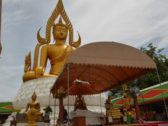 Der nächste Programmpunkt ist unproblematisch, verspricht mir Chowwitz und hält bei einem Tempel an. Ein riesiger goldener Buddha sitzt inmitten von roten Dekorationen. An den Wänden sind Bilder mit den Stationen seines Lebens aufgemalt. Chowwitz ist Buddhist wie 80 % des Landes und im Alter von zwanzig Jahren war er für ein Jahr ein Mönch.