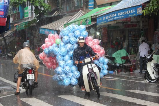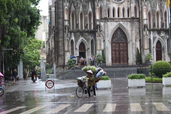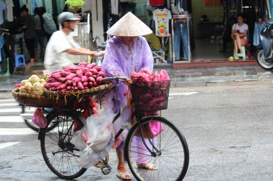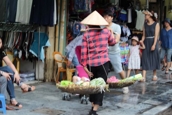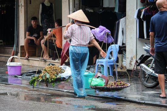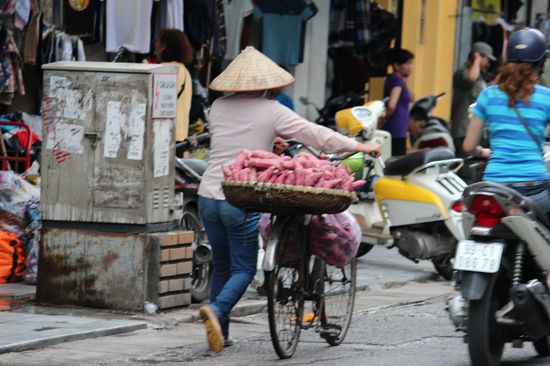 Als erstes fallen mir die Händlerinnen mit den spitzen Hüten auf. Sie verkaufen Blumen, Früchte und Gemüse. Ihre Waren tragen sie in Körben an langen Stangen auf den Schultern oder auf dem Fahrrad. Oder sie haben einen temporären Marktstand aufgebaut, den sie jederzeit wieder zusammenklappen und an einem anderen Ort aufbauen können.