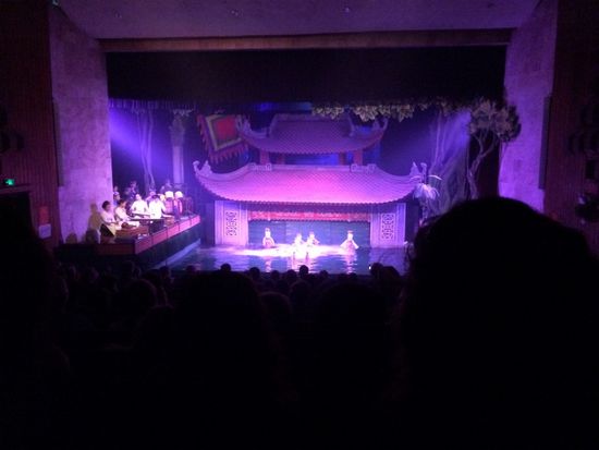 Die Puppen spielen im Wasser und werden von unten geführt. Sie erzählen Geschichten vom Fischen, von Drachen, Fröschen, von Liebschaften und Liebe. Dazu spielt ein Live Orchester und zwei Sängerinnen begleiten die Stimmen der Puppen. Alles zusammen eine sehr spezielle Kunst, die vor allem hier in Vietnam gepflegt wird. Das Puppentheater von Hanoi hat schon auf der ganzen Welt gespielt.
