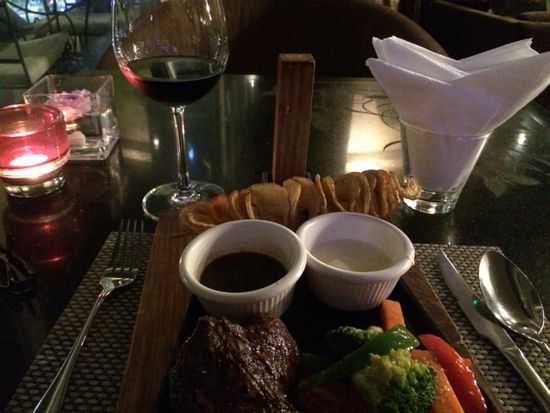 Heute mag ich keine Experimente beim Essen. Mein Geldbeutel ist mit einer Million Dong gefüllt, ich leiste mir heute ein feines Essen. In einem richtig vornehmen Restaurant ganz oben mit Blick über den Platz und den See kehre ich ein. Ein saftiges Stück Fleisch muss auf den Tisch. Und dazu ein Glas chilenischen Rotwein.