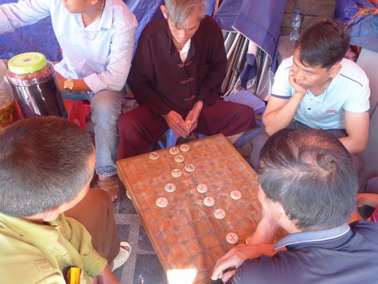Schwarze und weisse viereckige Spielsteine mit verschiedenen Symbolen liegen auf dem Tisch. In der hölzernen Tischplattte sind Muster eingeritzt und manchmal verschiebt jemand einen Stein. Dann wird diskutiert, Arme verworfen. Ich gehe eigentlich davon aus, dass zwei Männer gegeneinander spielen. Der eine erhält aber intensive Unterstützung von einem der Zuschauer. Ja öfters ist es sogar der Zuschauer der den Stein mit ausführlichen Erklärungen verschiebt. Manchmal wird er dann vom Spieler wieder zurück gelegt.