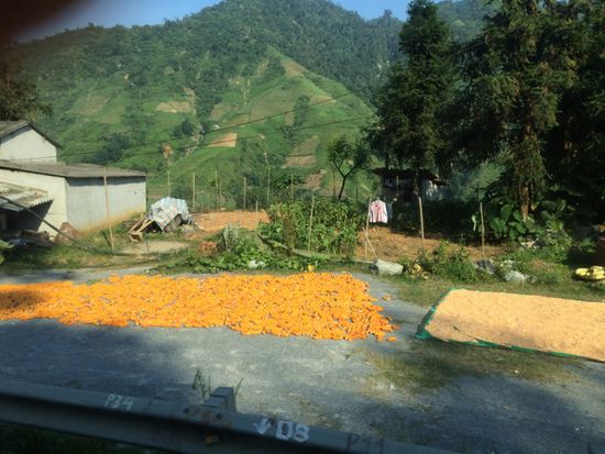 Wir sind auf der Bergstrasse unterwegs. Diesmal sitze ich auf der Talseite und geniesse fantastische Ausblicke auf die gegenüberliegenden Hänge und hinaus ins Tal. Am Strassenrand ist überall Mais ausgelegt. Zum Trocken oder zum Verkaufen, ich weiss es nicht.