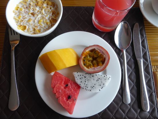 Der Zuckerrohrsaft war sozusagen der Aperitif, denn jetzt steuern wir unseren Mittagshalt an. Ein grosses Buffet mit den vielen Spesen steht uns zur Verfügung. Nudelsuppe mit verschiedensten Zutaten, Gemüse, gedämpft und roh, verschiedene Fleischsorten, Soya, Reis, ja sogar Sushi stehen bereit. Mir ist zu heiss, ich mag nicht viel essen. Trinke lieber etwas gekühlten Tee und halte mich an das Früchtebuffet.
