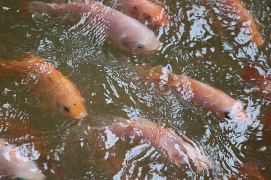 In einem der Wasserbecken schwimmmen ganz viele Koois, die neugierig näher kommen, als ich mich über die Mauer zu ihnen neige. Bestimmt erwarten sie jetzt Futter, das ich hier kaufen könnte.