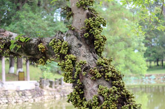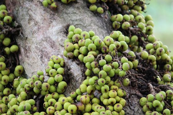Auf dem Weg entdecke ich diesen interessanten Baum. Sein Stamm ist über und über mit einer Art Feigen bedeckt. So einen Baum habe ich erst einmal gesehen: im Hotelgarten bei den Iguazu-Fällen. Er fasziniert mich auch diesmal wieder.