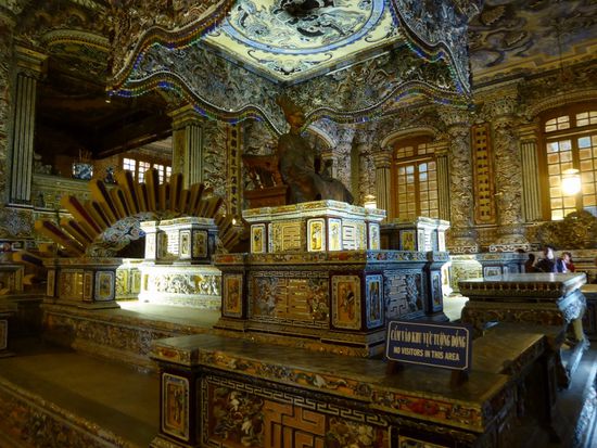 Nicht ohne Ticket draufsetzen steht auf einer Tafel daneben. Und tatsächlich, man darf sich für eine offizielle Foto auf den goldenen Thron setzen. Allerdings gehören dazu auch noch des Kaisers Kleider, die in einem Nebenraum auf Touristen warten.