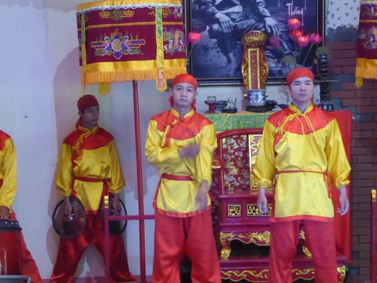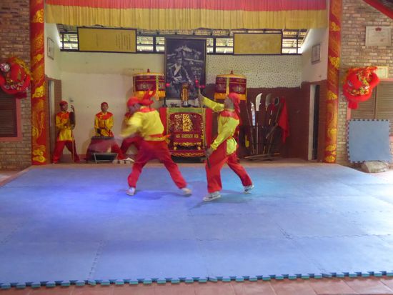 Bei der ersten Nummer, dem Tanz der zwei Löwen, die zusammen ein Löwenjunges machen und gebären, denke ich noch, dass das ganze wohl eine billige Touristenshow ist, doch nach und nach merke ich, dass da sehr viel Können und Konzentrationn dahinter steckt und die jungen Männer alles geben, um uns eine gute Show zu bieten. Sie zeigen uns einzelne Demonstrationen mit Schwertern und Lanzen. Showkämpfe bei denen es um Geschwindigkeit geht. Alles begleitet mit rhytmischen Trommel und Gongklängen.