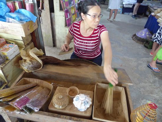 An einem Stand können wir zusehen, wie eine Frau die Räuchermasse auf dünne Bambusstäbchen rollt. Es ist eine Zimtmischung.