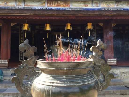 Aus dem Tempel ertönen Gesänge und Gebete. Davor eine grosse Schale mit Räucherstäbchen. Ich setze mich noch einen kurzen Moment hin, lasse die spezielle Stimmung in mich einfliessen.