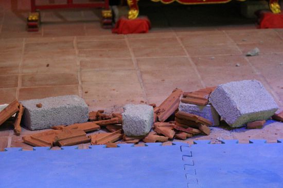 Und dann kommt der eigentliche Showact. Auf zwei Backsteine werden sechs Ziegel gelegt und einer der Kämpfer stellt sich dahinter auf. Konzentriert sich. Das ist an sich schon eine Leistung, denn immer wieder steht jemand auf, geht auf die Toilette, wechselt die Stellung, um eine bessere Sicht mit der Kamera zu bekommen. Der junge Mann steht da, fokussiert auf die Ziegel, in spürbarer innerer Anspannung. Ein paar Mal holt er mit dem Arm aus, um dann mit den gestreckten Fingern die Ziegel zu berühren. Und zurück, ein neuer Anlauf. Dann, nach gut zwei Minuten der ultimative Schlag. Die Ziegel liegen zertrümmert am Boden.