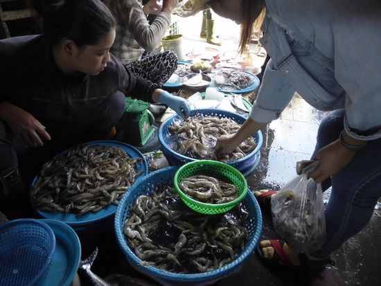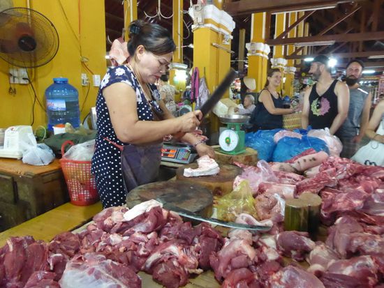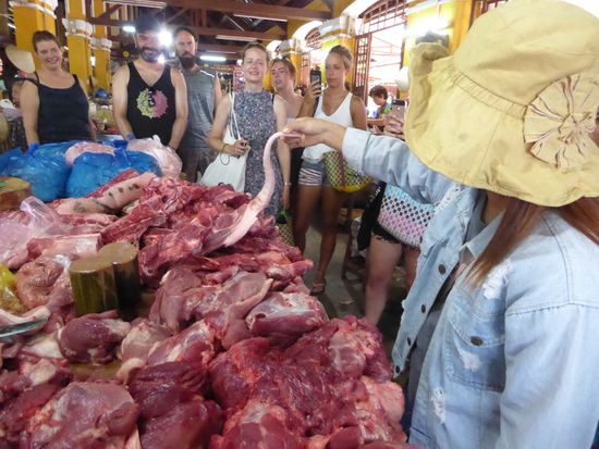 Beim Fleischstand kaufen wir Knochen. Energisch haut die Verkäuferin auf ein Gelenk ein. Ausbeinen, oder wie das ein Metzger bei uns nennen würde, damit kann sie nichts anfangen. Sie haut mit ihrem Beil auf den Knochen. Er gibt nicht nach. Also kommt der ganze auf die Waage. Dafür wird ein Kleinerer weggenommen. Und dann wird die ganze Waagschale in einen Plastiksack geschüttet und einem der Männer in den Korb gelegt. Wir kaufen Rindsknochen und etwas Schweinefleisch.