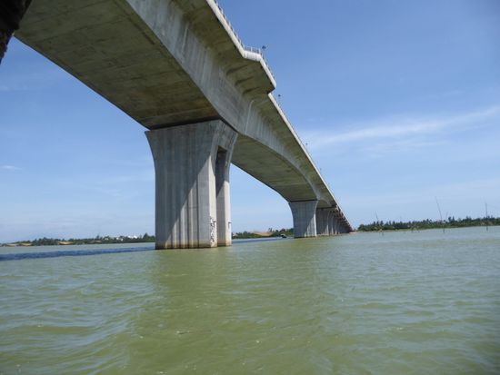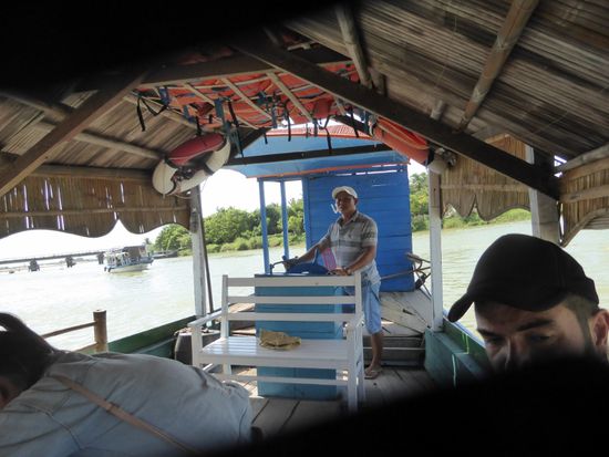Wir fahren unter einer grossen Brücke durch, fahren Richtung Meer. Hier wachsen ganze Wälder von Wasserkokosnusspalmen. Diese Pflanzen sind resistent gegen Salzwasser, denn hier im Delta wechselt der Wasserstand mit Ebbe und Flut, vermischt sich das Fluss- mit dem Meerwasser.