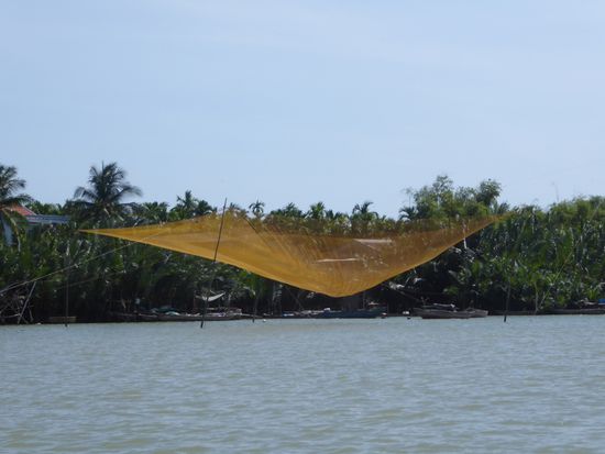 Auf dem Fluss sehen wir die grossen Netze der Fischer in den nahen Dörfern. Jede Familie hat ein Netz. Nachts werden die Netze ins Wasser gelassen und darüber wird eine Lampe angezündet. Die neugierigen Fische versammeln sich unter der Lampe und dann braucht nur noch das Netz zusammen gezogen werden.