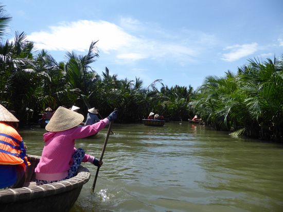 Wir werden erwartet. In runden Körben. Es sind Boote, bestimmt die speziellsten Boote, die ich je gesehen habe. Geflochten aus Bambus und mit einer Harz- oder Pechschicht wasserdicht gemacht. Sie drehen sich im Kreis wie Derwische. Immer zwei Personen sitzen in einem Boot und werden von einem Dorfbewohner gerudert. Direkt in den Palmenwald.