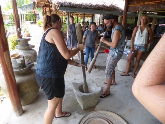 Die Reiskörner müssen zuerst von den Häutchen getrennt werden, das machen wir mit dem grossen Mörser. Da müssen alle Hand anlegen und Nhi feuert vor allem die Männer an. Mehr, mehr, schneller, mehr Kraft!