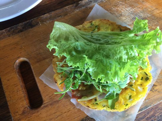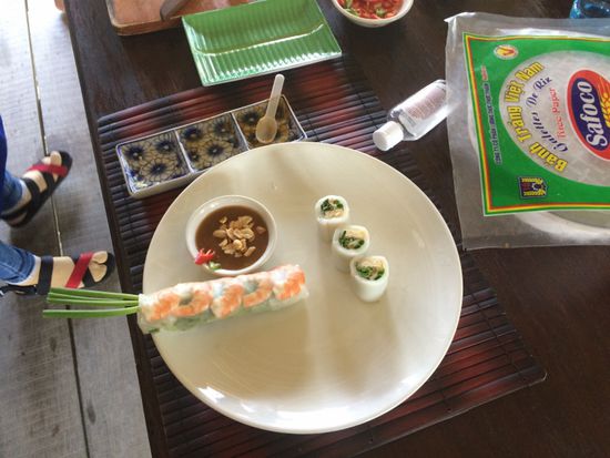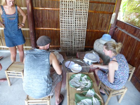Als nächstes gibt es Pfannkuchen, gemacht aus Reismilch, etwas gewürzt und gefüllt mit Crevetten und frischem Salat. Eingerollt in ein Reisblatt und dazu wieder eine selber gemachte Sosse.