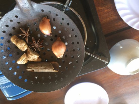 Zwiebelchen, Anissterne, Ingwer und eine Zimtrinde werden erst einmal über dem Gas geröstet. Wenn es anfängt zu riechen, Anis und Zimt in den Topf, der Rest darf noch etwas weiter rösten. Dann kommen alle Zutaten, zusammen mit den Knochen und einem Stück weissen Rettich in den Topf, dazu ein Teelöffel Pfeffer, auffüllen mit Wasser und das ganze darf jetzt für sich allein kochen.