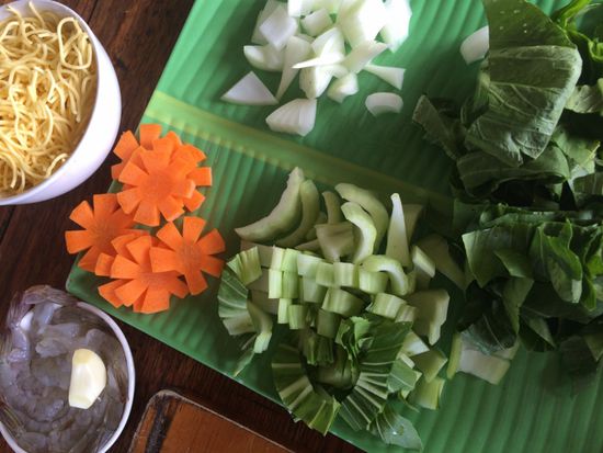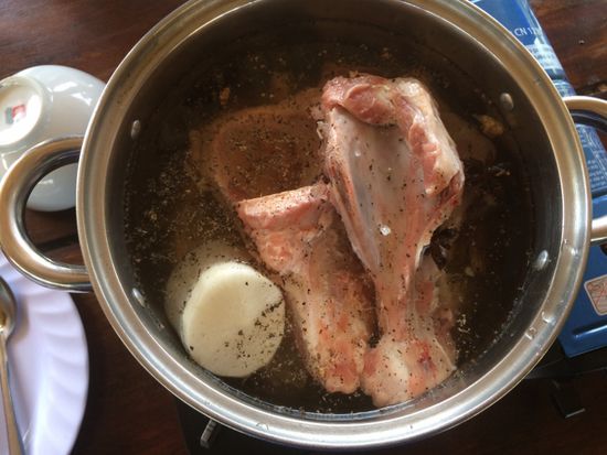 Die Helfer haben inzwischen die Knochen auf die verschiedenen Plätze verteilt. Immer zwei zusammen beginnen mit den Vorbereitungen für die Rinds-Nudelsuppe.